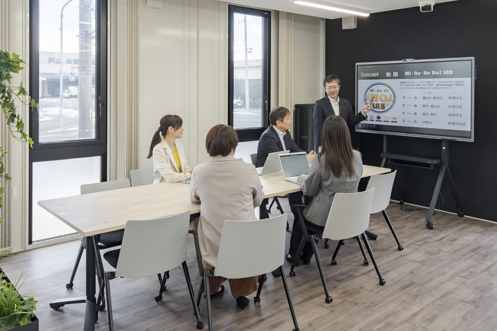 「Mi・No・Ru・Ho!」=Mi(Mind:技)・No(New Office:場)・Ru(Rule:型)・5つのHo!(帆を張る、進歩、稔る穂、保革、Hoっとする)を実現するライブオフィスです。