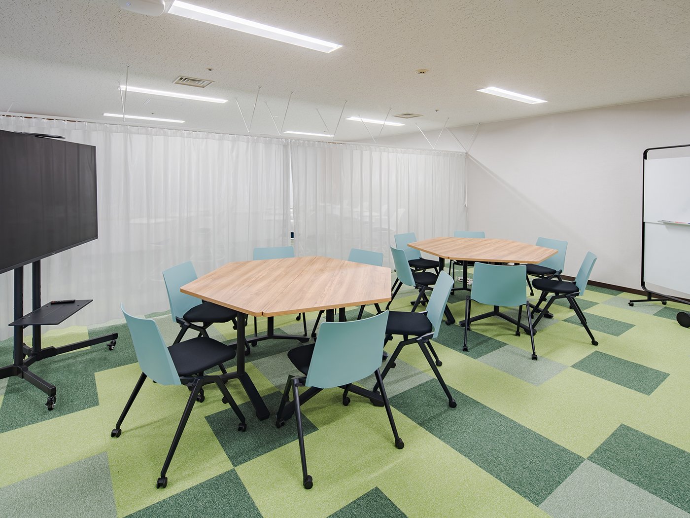 隣接する「ヘキサゴンエリア」「セミナーエリア」とは、高い吸音性能と透け感を両立した特殊なレースカーテンで緩やかに仕切られています。用途に合わせて開放することで、3つのエリアを一体的に利用することも可能です。