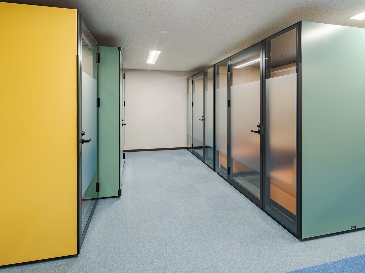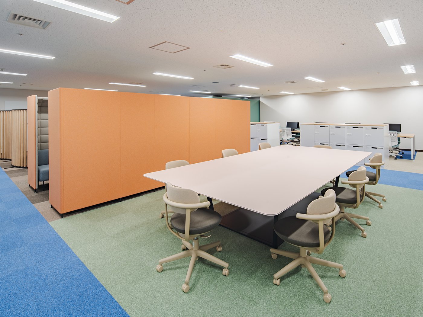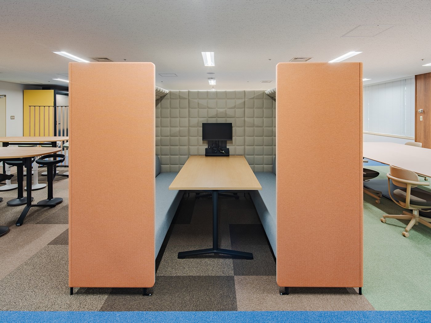 吸音効果の高い素材と、音漏れを軽減する独自の形状を追求したパネルブースシステム「フォーレ」を採用することで、周囲に配慮しつつ、ブース内でのクリアな対話環境を整えました。適度な囲われ感が、議論をより円滑に進めます。
