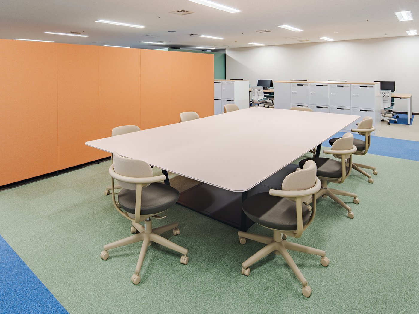 重厚感のあるミドルハイクラスの大型会議テーブルを採用した、大人数での利用に対応するエリアです。