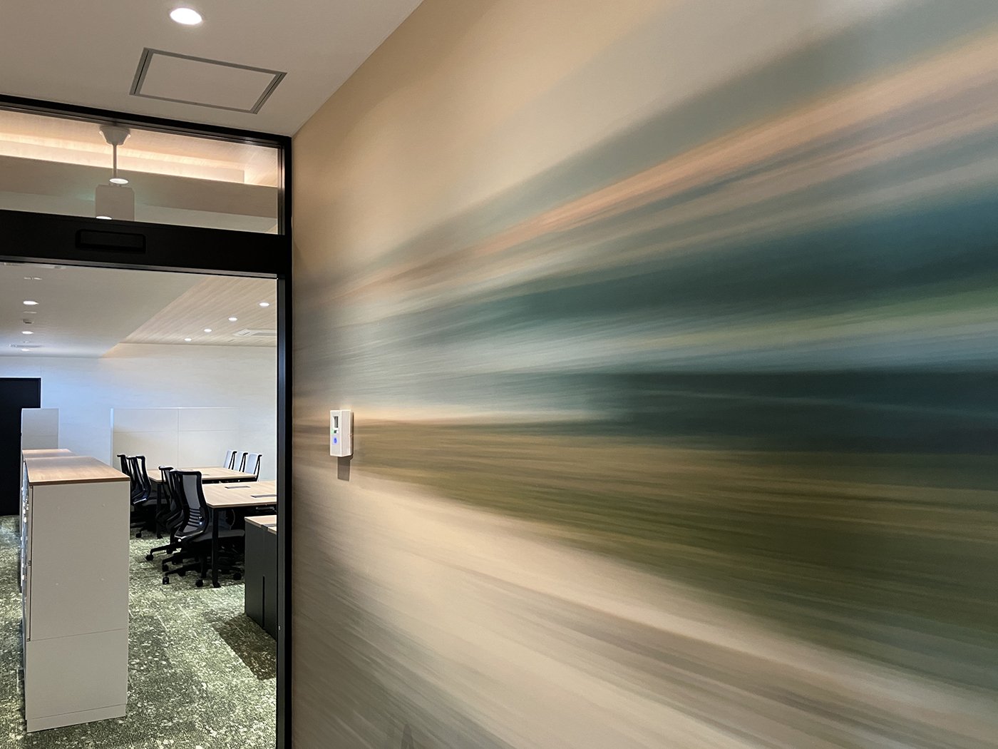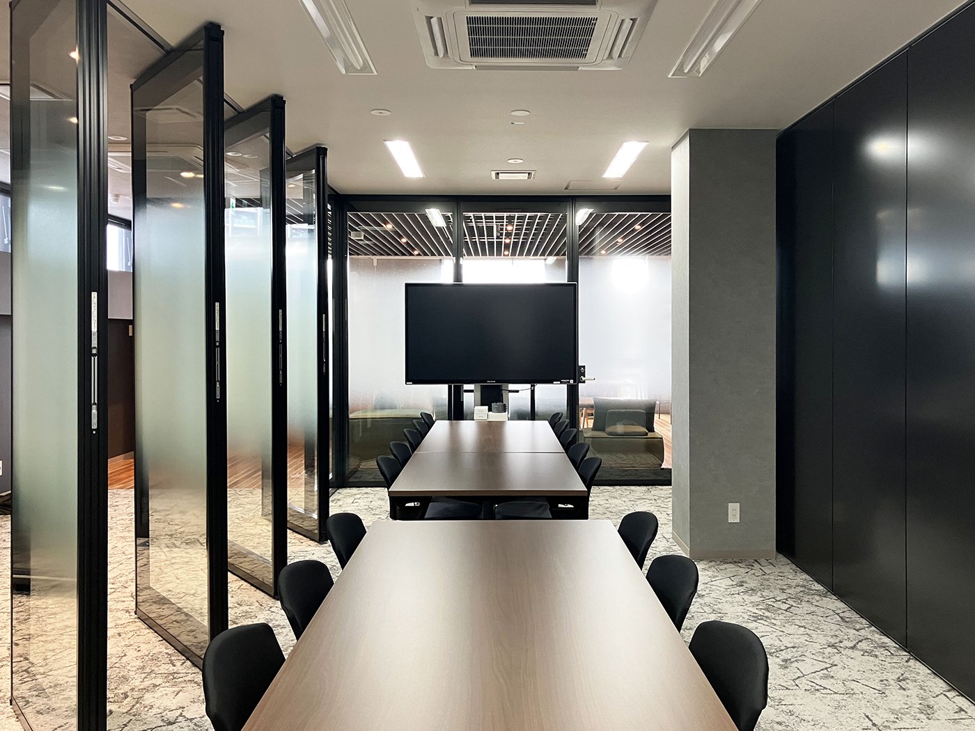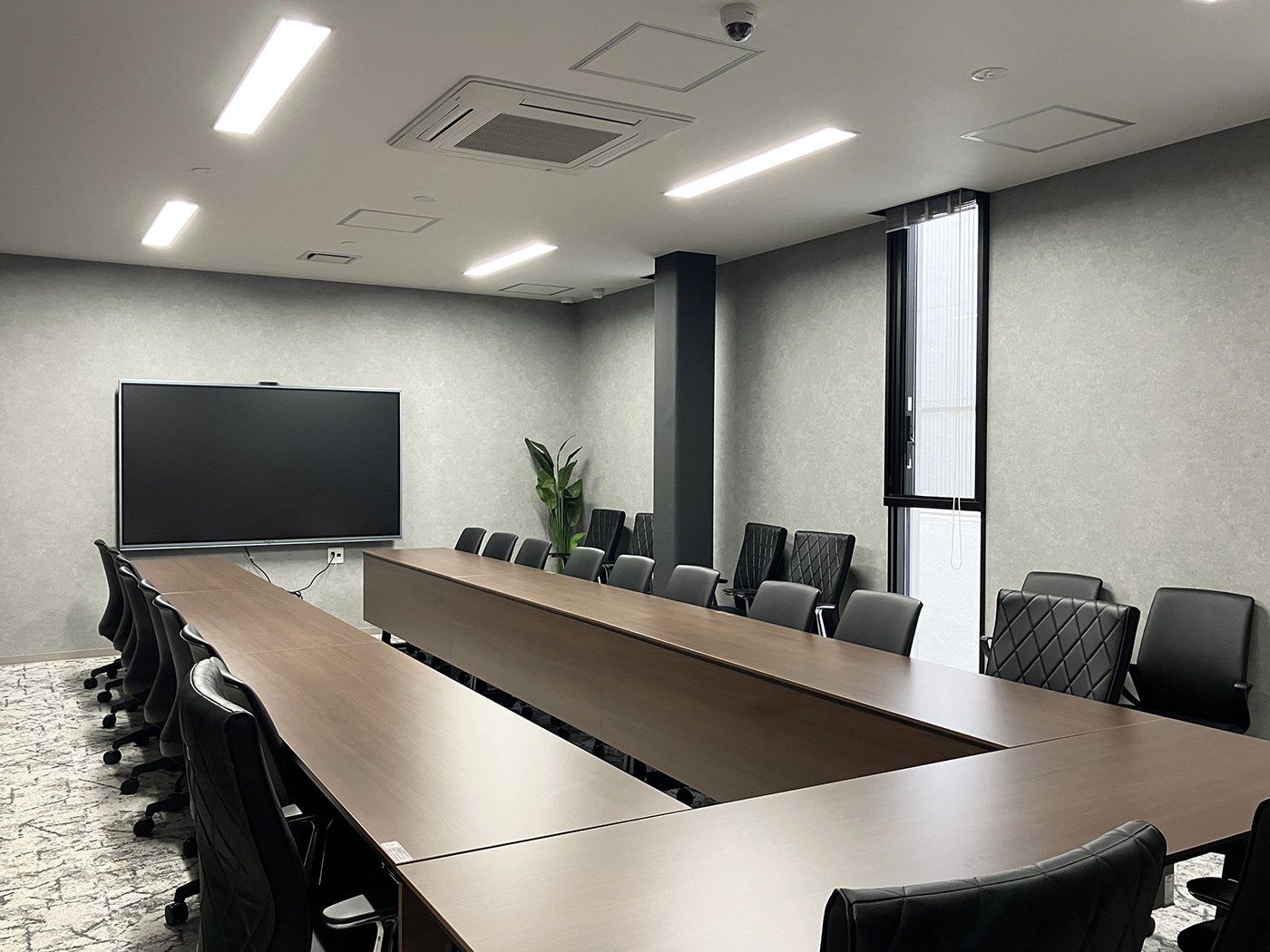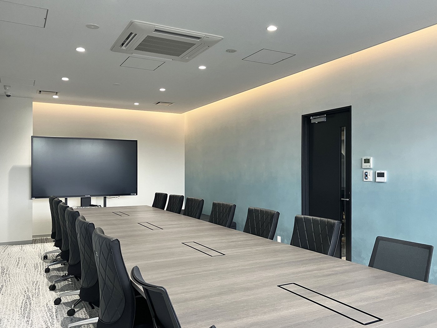 16名が着席できる広々とした応接会議室。壁面には、コーポレートカラーであるブルーのグラデーション壁紙を採用しました。