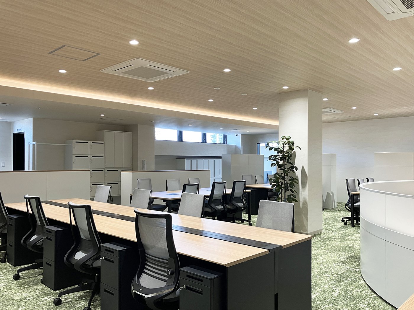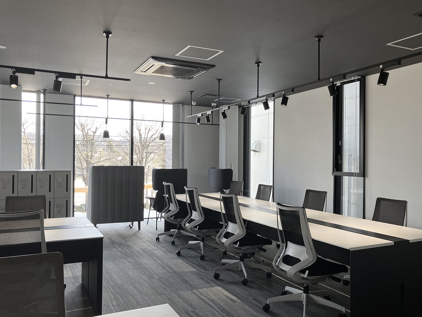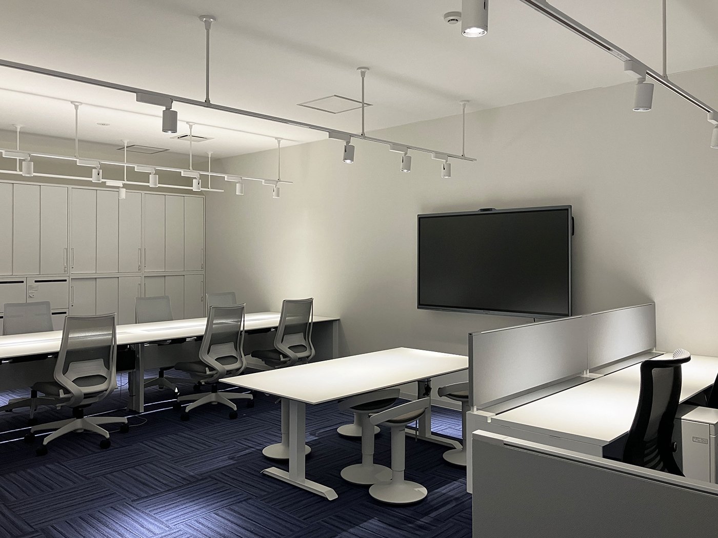 総務・DX・営業といった多様な部門が集い、新規事業の創出を目指すためのオープンな空間です。