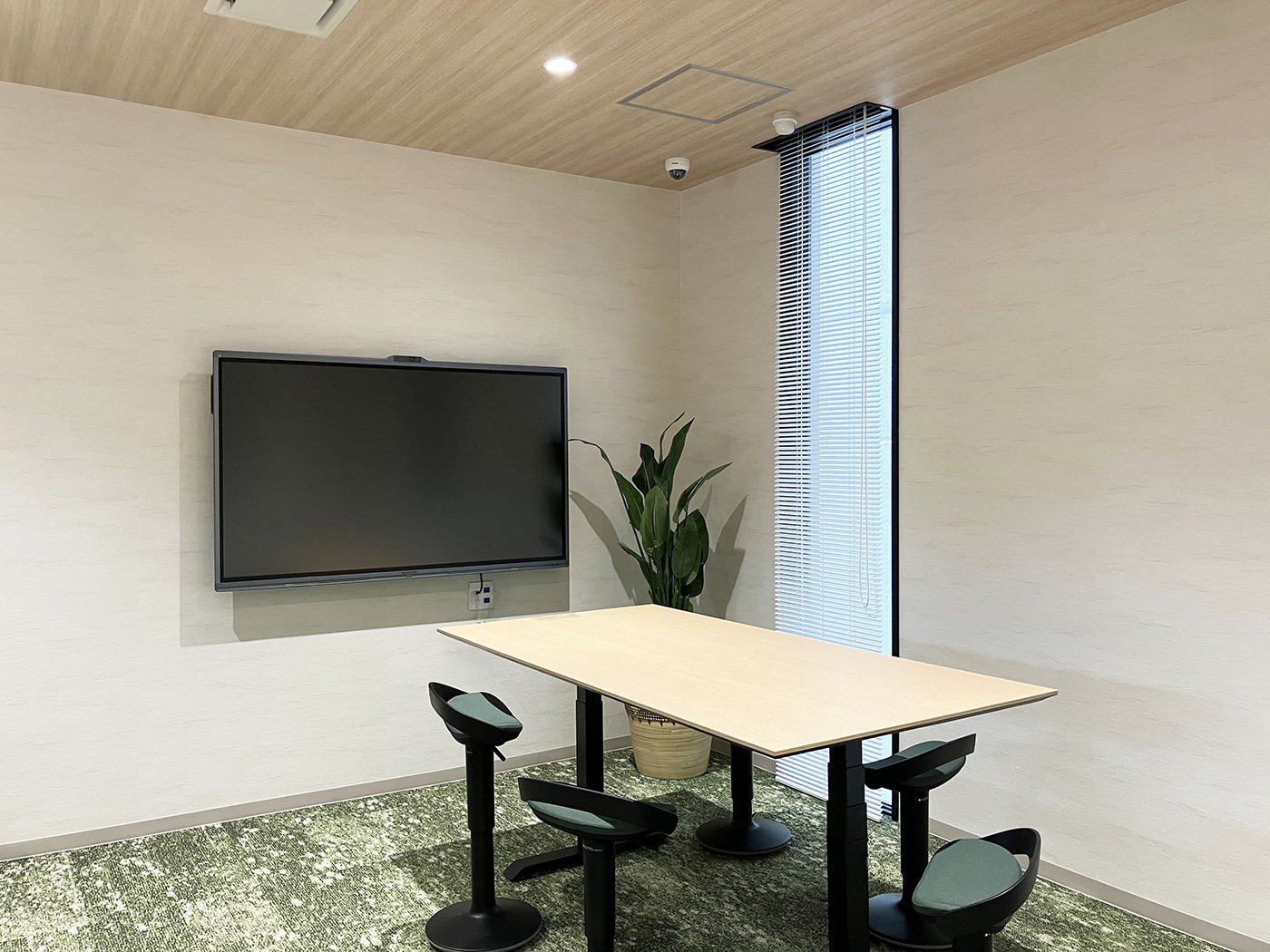 短時間で活発な議論を生む「スタンドミーティング」のためのスペースです。電動昇降テーブルと、軽く腰掛けられる昇降スツールを導入。会議の効率化を図り、コミュニケーションを活性化させます。
