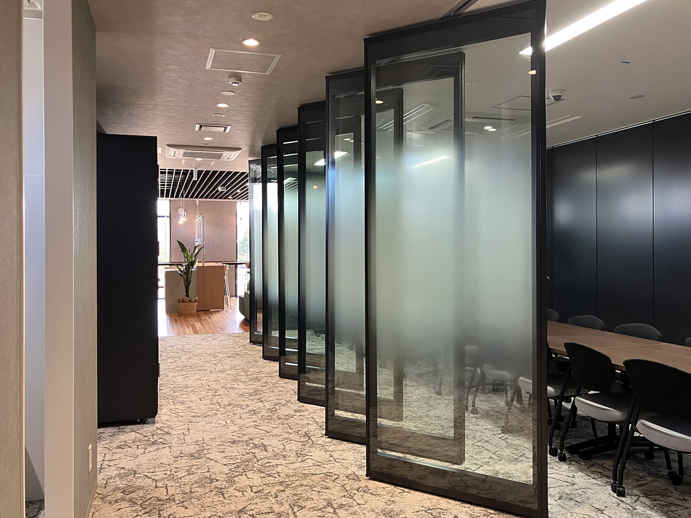 通路との仕切りには、回転式の移動間仕切り「リボルビングウォールクロス」を採用しました。ガラスならではの開放感を保ちつつ、高い遮音性も両立。ホールをオープンに拡張したり、静粛な独立空間として完全に仕切ったりと、用途に応じた柔軟な切り替えが可能です。