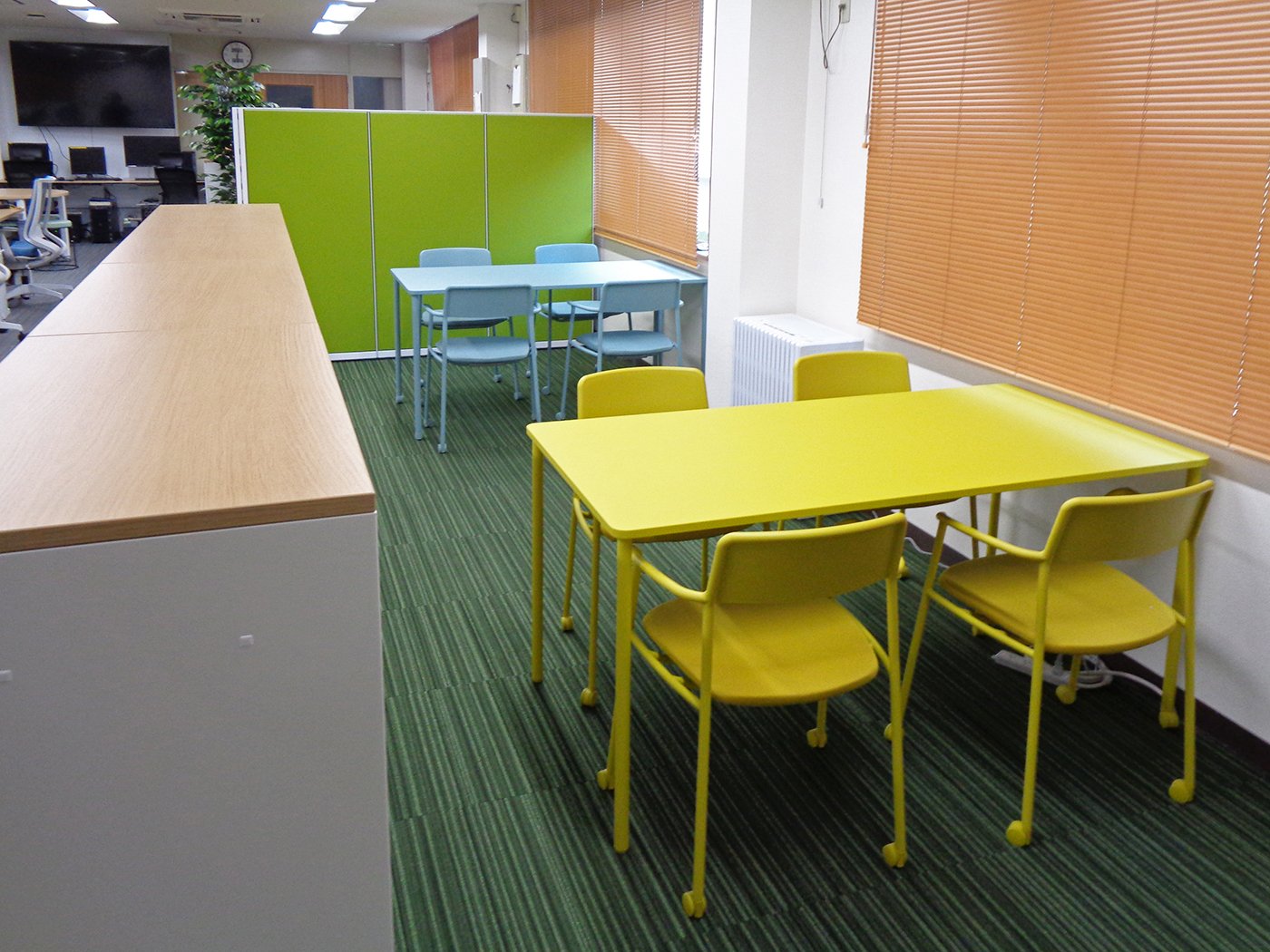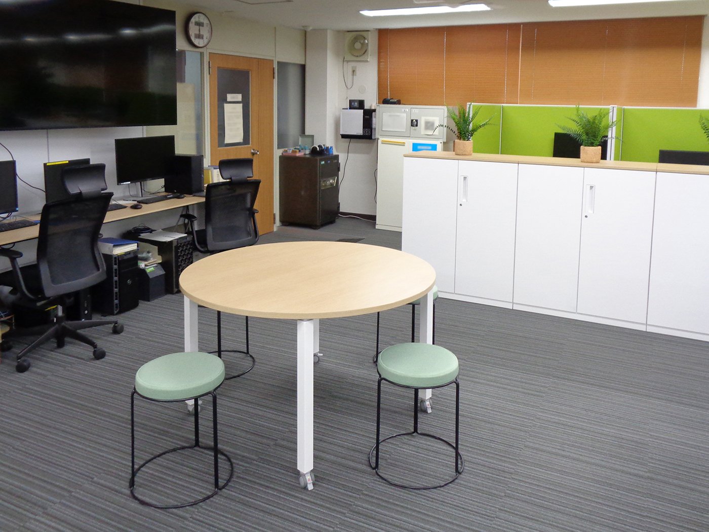キャスター付きのテーブルとチェアーがオフィス空間を明るく彩るとともに、利用人数に合わせた気軽なレイアウト変更を可能にしています。