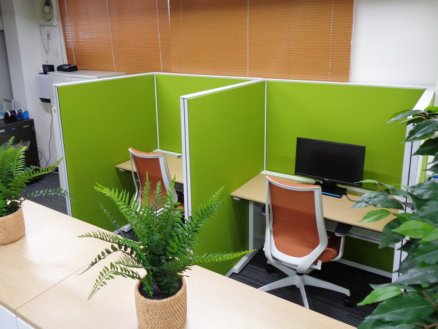 ブースの手前(通路側)には、間仕切りを兼ねた収納家具を配置。これにより背後からの視線を遮り、利用者が作業に集中できる環境を整えています。