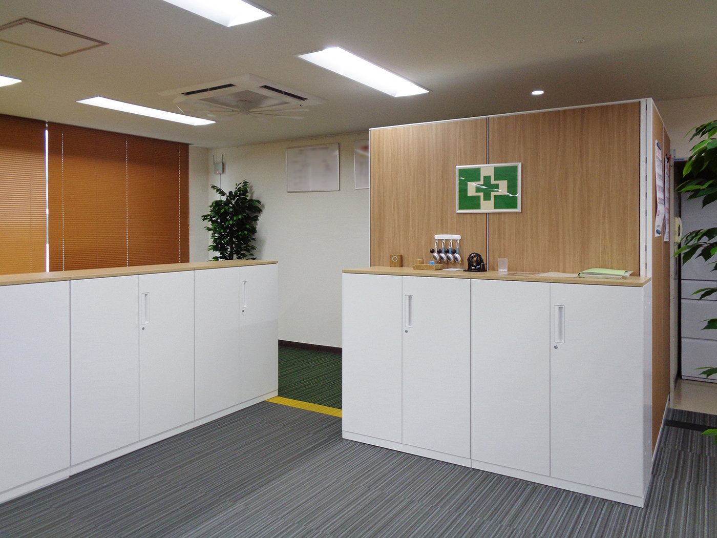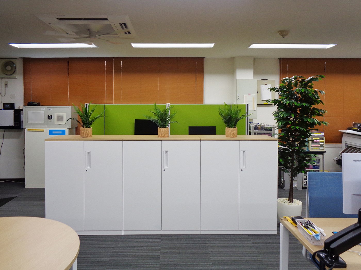 目線を遮らない高さに抑えることで、オフィスの開放感と一体感を保ちつつ、それぞれのエリアをゆるやかに仕切っています。執務スペースからも近いため、業務の効率化にもつながります。